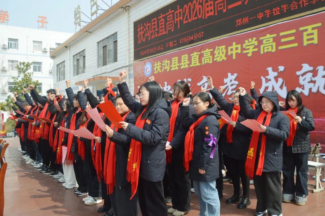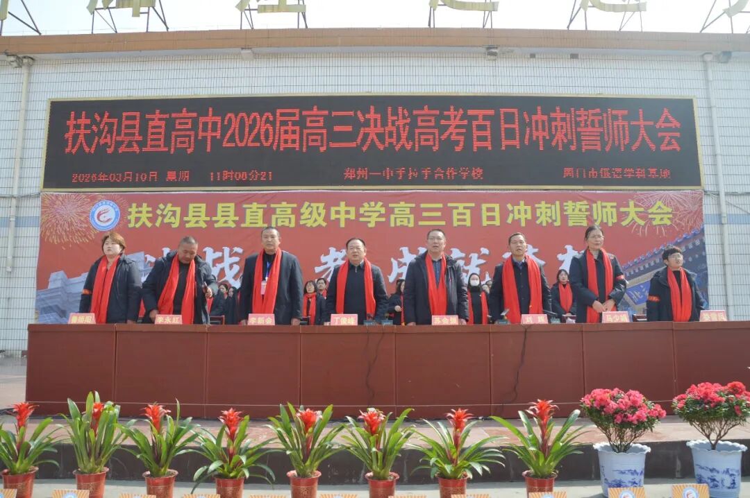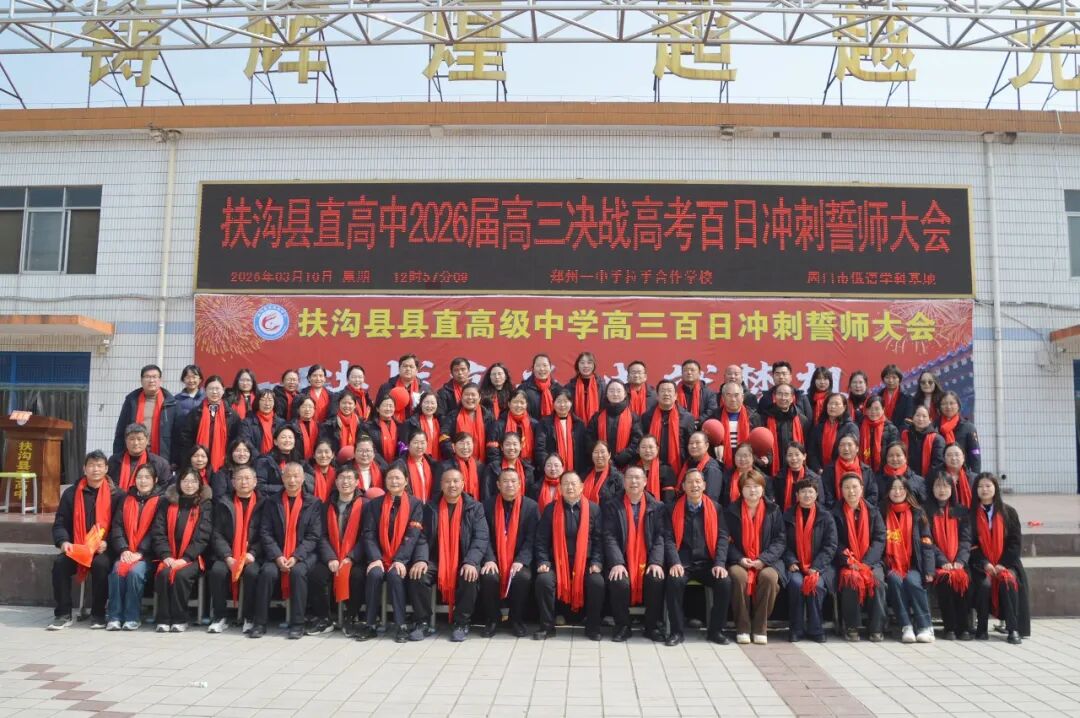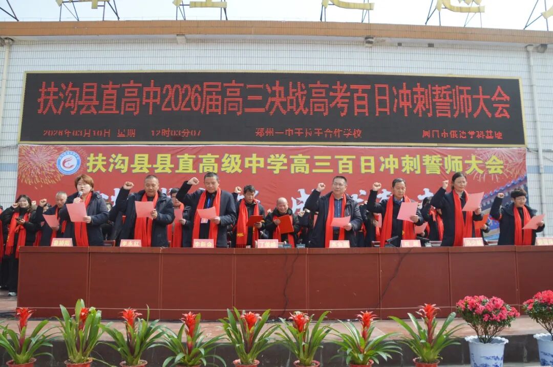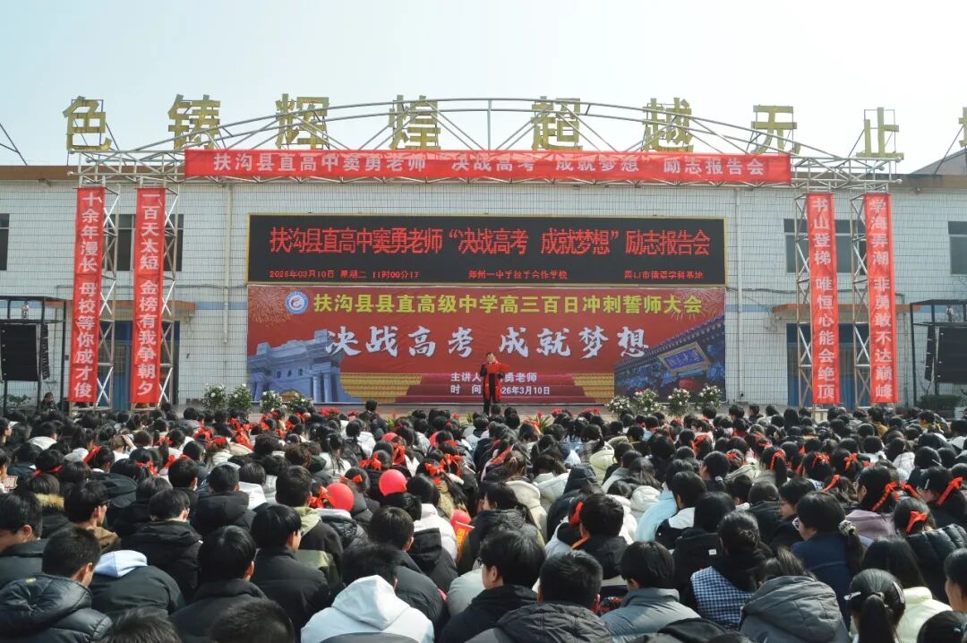 春风浩荡催征帆,百日鏖战铸荣光。为砥砺学子鸿鹄之志,凝聚师生奋进之力,擂响高考冲刺的战鼓,我校于2026年3月10日上午,隆重举行高考励志报告会暨2026届高考百日誓师大会。学校党总支书记丁俊峰、校长张团刚等领导与高三全体师生参加了此次大会,大会由高三年级副主任刘辉主持。